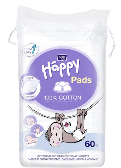 3-vrstvové bavlnené vatové vložky Bella Baby Happy sú určené na starostlivosť o tvár, rúčky a oblasť pod plienkami bábätka.