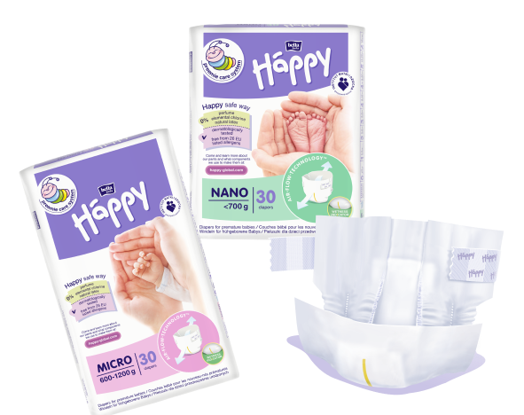 Výnimočné plienky pre predčasne narodené deti. Vďaka použitiu technológie Preemie Care System máte istotu, že je o bábätko postarané najlepšie, ako sa dá. Bezpečnosť plienok Bella Baby Happy Nano potvrdzujú dermatologické testy a pozitívne stanovisko Inštitútu matky a dieťaťa.